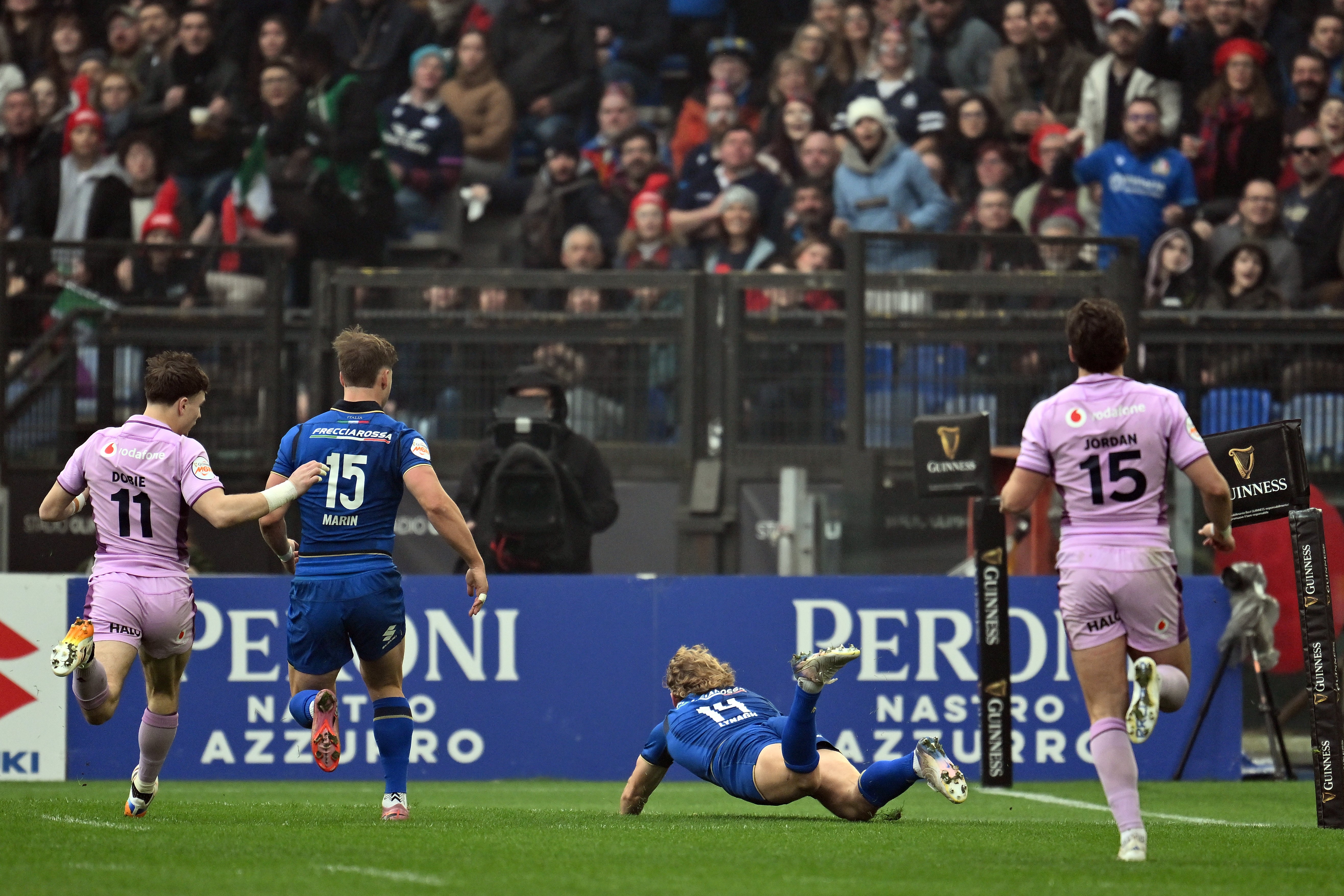 Tommaso Menoncello sprints down the left wing to attain Italy’s second try to Paolo Garbisi provides the conversion.